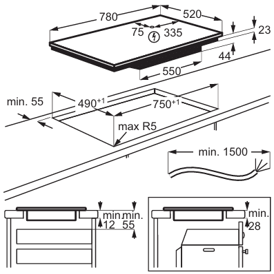 Bordkomfurdetaljer4 x induktion – 2300/3200 W – 210 mm – booster
