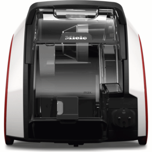 Støvbeholderen kan nemt tages ud ovenfra, og beholderen tømmes med blot et enkelt klik på en knap ned i skraldespanden. Tømningen er meget hygiejnisk, idet der ikke er direkte kontakt med støvet, og beholderen tømmes fuldstændigt.
