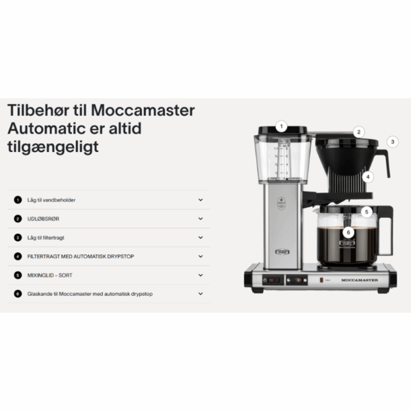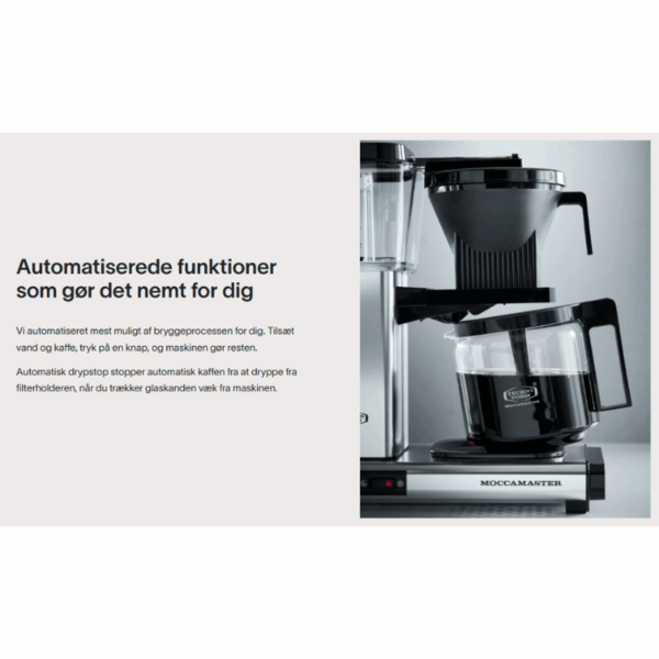 Moccamaster Automatic har automatisk drypstop, så bryggeprocessen bliver enkel for dig. Kaffemaskinen laver op til 10 kopper / 1,25 liter udsøgt kaffe på 6 minutter.